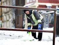 Staff at Memorial University clear snow from an overnight spring snowstorm in St. John's, N.L., on Saturday, April 25, 2026. THE CANADIAN PRESS/Paul Daly
