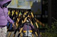 A child wearing a face mask is accompanied by her guardian as she walks through a barricade placed outside a school in Beijing, Monday, Oct. 10, 2022. (AP Photo/Andy Wong)