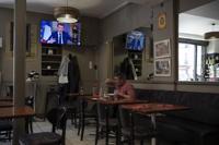 A man eats his lunch at a bar while French President Emmanuel Macron speaks with journalists on television in Marseille, southern France, Wednesday, March 22, 2023. Macron said Wednesday that the pension bill that he pushed through without a vote in parliament needs to be implemented by the "end of the year."(AP Photo/Daniel Cole)