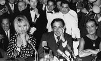 FILE - French Actress Brigitte Bardot, left, attends a news conference in Mexico City, Jan. 18, 1965. Seated next to her is producer Louis Malle and at right is French actress Jeanne Moreau. (AP Photo/File)