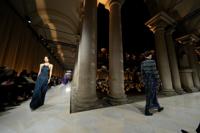 During the show, models walked slowly in pairs, women half a step in front of the men, around the colonnaded courtyard filled with the same glowing paper lanterns that had lit Armani’s showroom for the public viewing attended by 15,000 mourners.