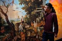A visitor looks at a tapestry titled: "The Great Narco Ark" by Carlos Castro during an exhibit featuring Colombian artists that seeks to critique the hippos brought by late drug lord Pablo Escobar in Bogota, Colombia, Thursday, Nov. 6, 2025. (AP Photo/Fernando Vergara)