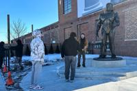 People pose for photos with a RoboCop statue that stands outside a business in Detroit's Eastern Market area, Thursday, Dec. 4, 2025. (AP Photo/Mike Householder)
