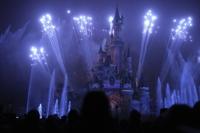 A light show is projected on the castle of Sleeping Beauty as fireworks explode in Disneyland, in Marne-la-Vallee, east of Paris, Friday Jan. 17, 2025. (AP Photo/Thibault Camus)
