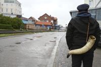 A man parades across a street with a cow horn on his back on the Borkum island in Germany, Thursday, Dec. 5, 2024 before on the evening of Dec. 6, young, unmarried men dress up as so-called Klaasohms with masks, sheepskins and bird feathers. (Lars Penning/dpa via AP)