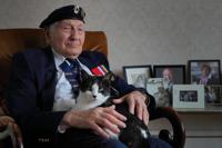 FILE - Mervyn Kersh D-Day veteran who fought in the Normandy Campaign, with his cat Joey at his home in London, Monday, April 8, 2024. (AP Photo/Kirsty Wigglesworth, File)