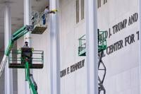 Workers add President Donald Trump's name to the John F. Kennedy Memorial Center for the Performing Arts, after a Trump-appointed board voted to rename the institution, in Washington, Friday, Dec. 19, 2025. (AP Photo/J. Scott Applewhite)
