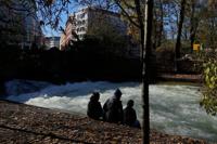 People sit at the Eisbach, where the famous wave usually forms, in Munich, Germany, Wednesday, Nov. 5, 2025. (AP Photo/Matthias Schrader)