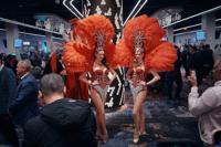 Showgirls in feathered costumes pose for photos during the opening of a casino floor at Resorts World New York City on Tuesday, April 28, 2026, in New York. (AP Photo/Andres Kudacki)
