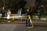 A police office blocks off a street near Rob Reiner's residence Sunday, Dec. 14, 2025, in the Brentwood section of Los Angeles. (AP Photo/Ethan Swope)