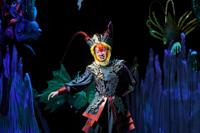 Since Monkey King has to perform supernatural feats, engage in acrobatic fighting, shift his shape at will, and also — this is an opera, after all — perform arias accompanied by full orchestra, the creators represent him by three different figures: a singer, a puppet and a dancer.