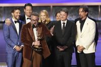 Seth Rogen, center, and the team from "The Studio" accept the award for outstanding comedy series during the 77th Primetime Emmy Awards on Sunday, Sept. 14, 2025, at the Peacock Theater in Los Angeles. (AP Photo/Chris Pizzello)