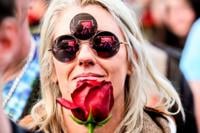 Sarah Black holds a rose while attending a public memorial for Grateful Dead guitarist Bob Weir on Saturday, Jan. 17, 2026, in San Francisco. (AP Photo/Noah Berger)