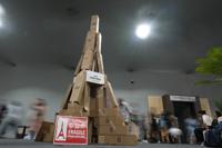 Attendees walk past boxes made to look like the Eiffel Tower with a sign that reads "1.5 degrees Celsius under threat" talking about the Paris Agreement during the COP30 U.N. Climate Summit, Monday, Nov. 17, 2025, in Belem, Brazil. (AP Photo/Andre Penner)