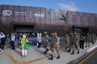 Brazilian firefighters walk outside the venue for the COP30 U.N. Climate Summit, Monday, Nov. 10, 2025, in Belem, Brazil. (AP Photo/Fernando Llano)