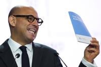 Simon Stiell, United Nations climate chief, holds up a pamphlet that reads The Paris Agreement at the COP30 U.N. Climate Summit, Monday, Nov. 10, 2025, in Belem, Brazil. (AP Photo/Fernando Llano)