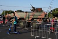 A military tank is stationed outside of the COP30 U.N. Climate Summit as a person rides by on an electric scooter Monday, Nov. 10, 2025, in Belem, Brazil. (AP Photo/Fernando Llano)