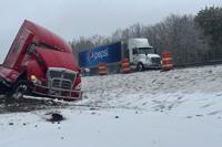 A tractor-trailer hauling a load of oranges sits on the side of the road after sliding off the Maine Turnpike early on Wednesday, Dec. 11, 2024, in New Gloucester, Maine. (AP Photo/David Sharp)
