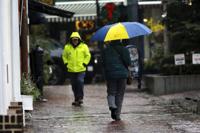 People walk through the rain as a storm system and possible "bomb cyclone" hit the U.S. East Coast, Wednesday, Dec. 11, 2024 in Portsmouth, N.H. (AP Photo/Caleb Jones)