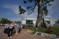 Attendees walk past members of an Indigenous group selling items outside the COP30 U.N. Climate Summit, Tuesday, Nov. 18, 2025, in Belem, Brazil. (AP Photo/Andre Penner)