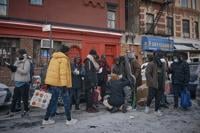 Migrants pick up clothes as mutual aid groups distribute food and clothes under cold weather near the Migrant Assistance Center at St. Brigid Elementary School, on Saturday, Jan. 20, 2024, in New York. (AP Photo/Andres Kudacki)
