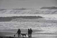 Visitors walk along the beach as high surf comes in Ventura, Calif., Tuesday, Dec. 24, 2024. (AP Photo/Damian Dovarganes)