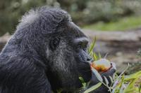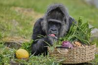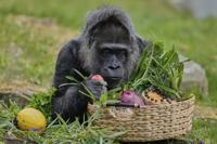 Female gorilla Fatou, the oldest of Berlin's zoo and also believed to be the world's oldest gorilla, enjoys her birthday basket with a "gorilla food surprise", as the zoo celebrates her 68th birthday in Berlin, Germany, Friday, April 11, 2025. (AP Photo/Ebrahim Noroozi)