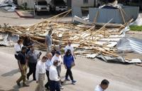 FEMA Administrator Deanne Criswell, blue FEMA hat, visits an apartment complex damaged by severe storms with Houston Mayor John Whitmire, to her right, and Harris County Precinct 4 Commissioner Lesley Briones, to her left, Tuesday, May 21, 2024, at Spring Branch in Houston. (Yi-Chin Lee/Houston Chronicle via AP)