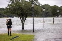 Brianna Quick holds her dog Hina while checking out the coastal flooding in the Colonial Place neighborhood of Norfolk, Va., as a result of Hurricane Erin, Thursday, Aug. 21, 2025. (Kendall Warner/The Virginian-Pilot via AP)