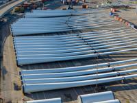 FILE - Wind turbine blades sit at The Portsmouth Marine terminal that is the staging area for Dominion Energy Virginia, which is developing Coastal Virginia Offshore Wind, Dec. 22, 2025, in Portsmouth, Va. (AP Photo/Steve Helber, File)