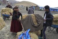 Residents carry fodder for their animals at the Cconchaccota community in the Apurimac region of Peru, Friday, Nov. 25, 2022. The delivery of packages of fodder oats for the surviving sheep, cattle, alpacas and llamas is the long-delayed response from the regional authorities to the ongoing drought. (AP Photo/Guadalupe Pardo)