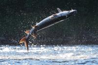 A shortnose sturgeon crashes down on its back after leaping from the Kennebec River, Wednesday, July 23, 2025, in Augusta, Maine. Scientists speculate the mysterious behavior may be anything from a form of communication to parasite removal. (AP Photo/Robert F. Bukaty)