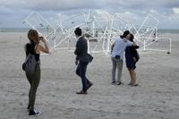 People walk past a light sculpture titled Patria y Vida created by Cuban-American artists Ruben Millares and Antonia Wright, during Miami Art Week, Thursday, Dec. 1, 2022, in Miami Beach, Fla. The sculpture is named for the anti-communism protests in Cuba. It is meant to celebrate people's right to protest, using the barricades as a symbol of global resistance. (AP Photo/Lynne Sladky)