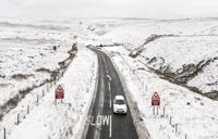 A car moves on the A57 Snake Pass between snowy fields near Glossop, England, Tuesday Nov. 19, 2024. (Danny Lawson/PA via AP)