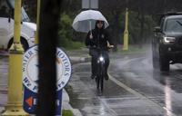 A cyclist tries to keep the rain at bay while pedaling on River Street in Santa Cruz, Calif., Wednesday, Jan. 11, 2023. (Shmuel Thaler/The Santa Cruz Sentinel via AP)