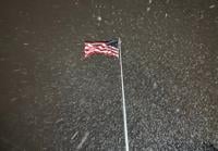 A flag ripples in the wind as snow falls in Lowville, New York, on Tuesday night, Dec. 9, 2025. The area faces a winter storm warning through Thursday. (AP Photo/Cara Anna)