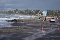 People make their way past a walkway and parking lot eroded by a combination of recent heavy rains and high tides at Cardiff State Beach Friday, Nov. 21, 2025, in Solana Beach, Calif. (AP Photo/Gregory Bull)