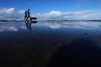 People make their way through a walkway and parking lot eroded by a combination of recent heavy rains and high tides at Cardiff State Beach Friday, Nov. 21, 2025, in Solana Beach, Calif. (AP Photo/Gregory Bull)