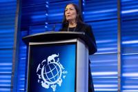 Interior Secretary Deb Haaland announces that her agency will work to restore more large bison herds during a speech for World Wildlife Day at the ɫtv Geographic Society in Washington, Friday, March 3, 2023. (AP Photo/Andrew Harnik)