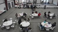 People gather at the Norfolk Southern Railways Assistance Center Thursday, Feb. 9, 2013, at the Abundant Life Fellowship in East Palestine, Ohio. Cleanup continues of a Norfolk Southern freight train derailment that derailed Friday night in East Palestine, Ohio. (AP Photo/Gene J. Puskar)