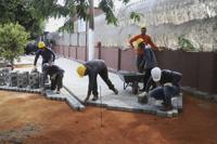 Workers prepare a sidewalk on the banks of the Guajara Bay as part of preparations for upcoming COP30 U.N. Climate Summit, in Belem, Brazil, Sept.18, 2025. (AP Photo/Paulo Santos)