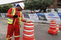 A worker blocks the street to car traffic during construction for the upcoming COP30 U.N. Climate Summit in Belem, Brazil, Sept.18, 2025. (AP Photo/Paulo Santos)