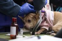 Jasmine, 11, receives an anti-flea vaccination at a free dog vaccine clinic to combat a canine Parvovirus outbreak on Monday, Feb. 3, 2025, in the Tenderloin in San Francisco. (AP Photo/Emily Steinberger)