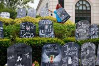 FILE - Jayde Newton helps to set up cardboard gravestones with the names of victims of opioid abuse outside the courthouse where the Purdue Pharma bankruptcy is taking place in White Plains, N.Y., on Aug. 9, 2021. (AP Photo/Seth Wenig, File)