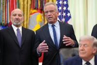 Health and Human Services Secretary Robert F. Kennedy Jr. speaks as President Donald Trump and Commerce Secretary Howard Lutnick listen during an event on health care affordability in the Oval Office at the White House, Thursday, April 23, 2026, in Washington. (AP Photo/Mark Schiefelbein)