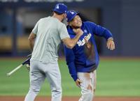 L.A. Dodgers manager Dave Roberts, right, reacts in pain after he wipes out and falls while running the bases during batting practice ahead of game 6 of the World Series against the Toronto Blue Jays in Toronto on Thursday, October 30, 2025. THE CANADIAN PRESS/Nathan Denette