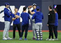 Los Angeles Dodgers' Shohei Ohtani, centre, rehearses his pitch during batting practice ahead of game 6 of the World Series against the Los Angeles Dodgers in Toronto on Thursday, October 30, 2025. THE CANADIAN PRESS/Nathan Denette