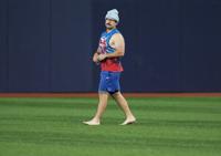 Toronto Blue Jays pitcher Kevin Gausman stretches out his arm during practice ahead of game 6 of the World Series against the Los Angeles Dodgers in Toronto on Thursday, Oct. 30, 2025. THE CANADIAN PRESS/Nathan Denette