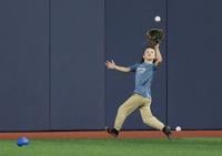 Toronto Blue Jays manager John Schneider's son Gunner catches a ball during batting practice ahead of game 6 of the World Series against the Los Angeles Dodgers in Toronto on Thursday, Oct. 30, 2025. THE CANADIAN PRESS/Nathan Denette
