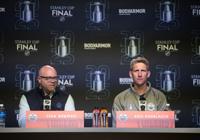 Edmonton Oilers general Manager Stan Bowman and head coach Kris Knoblauch speak to media before Game 1 of the Stanley Cup final against the Florida Panthers in Edmonton on Tuesday, June 3, 2025. THE CANADIAN PRESS/Jason Franson